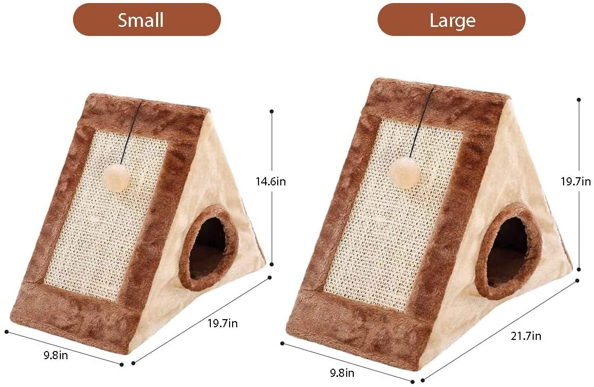 1.Design: The triangular design provides a safe, comfortable cocoon sanctuary that also features two scratching boards, adorned on both sides of the triangle hideaway bed, provide hours of fun and play time for your cats, and reduce furniture damage caused by scratches