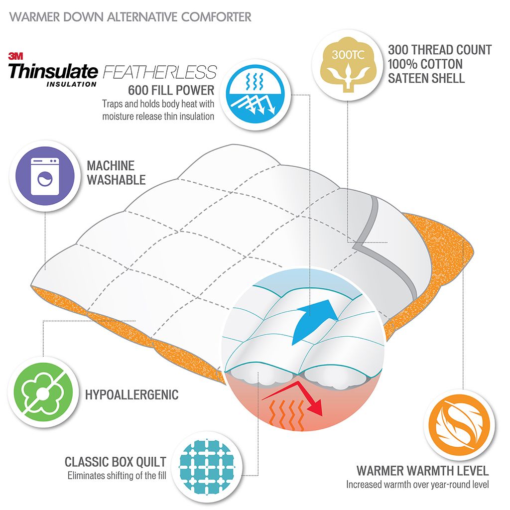 The Sleep Philosophy® down alternative twin comforter collection features 3M™ Thinsulate™ Featherless Insulation-600 Fill Power, a kinder alternative to natural down. This revolutionary, loose fill-down alternative mimics or surpasses the performance of natural down in Fill Power, loft and overall performance. Made of durable, lightweight polyester fibers, 3M™ Thinsulate™ Featherless Insulation provides warmth without a single feather.The Sleep Philosophy® down alternative comforter collection features a silky-soft 300 thread count, 100% cotton sateen cover. The comforters have sewn through box quilting so that the down-alternative fill doesn't bunch or shift. Four corner loops on the comforter can be tied to help secure it within a duvet cover. The filling is also hypoallergenic so you'll have a comfortable "sneeze-free" night's sleep. It's also machine washable for easy care. This comforter is also OEKO-TEX certified, meaning it does not contain any harmful substances or chemicals, ensuring quality comfort and wellness. Items in the set may come in a rolled or compressed packaging, which will need to be fluffed up or steam ironed before use to remove wrinkles.A great night's sleep never goes out of style. That's our Sleep Philosophy.